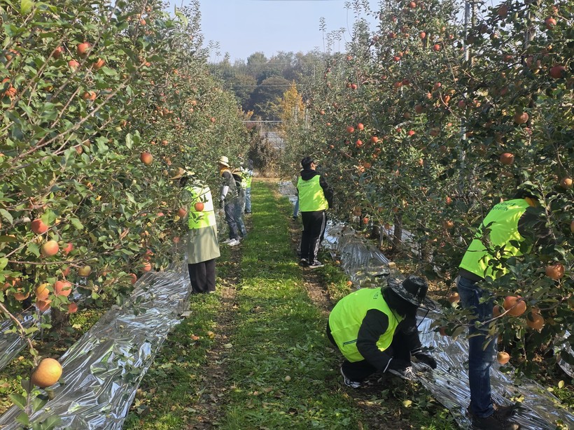 [일요주간=김완재 기자] NH농협은행(은행장 강태영) 자금시장부문이 글로벌 금융기관 BNP파리바와 손잡고 경기도 포천시 관인농협 관내 사과 농가에서 농촌 일손 돕기에 나섰다. 이번 활동은 수확기를 맞은 농가의 인력난을 해소하고, 금융기관의 사회적 책임을 실천하기 위한 취지로 진행됐다.