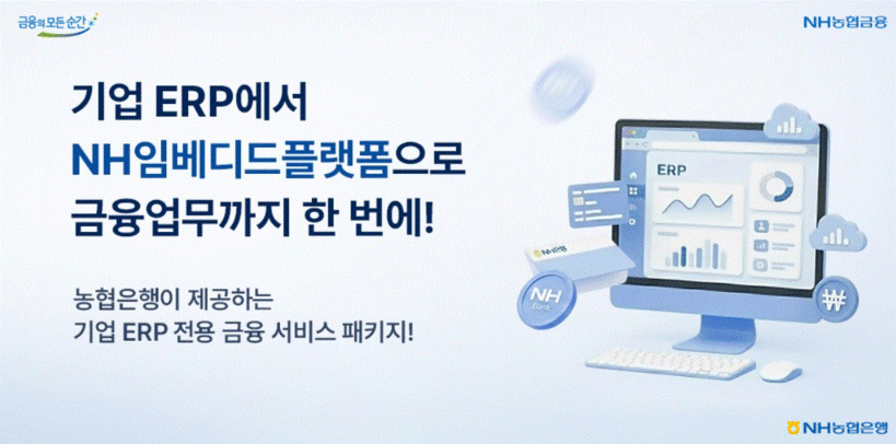 [일요주간 = 김완재 기자] NH농협은행(은행장 강태영)은 28일 기업 고객이 ERP 시스템 내에서 계좌조회부터 자금·급여 이체까지 주요 금융업무를 직접 처리할 수 있도록 지원하는 ‘NH임베디드플랫폼’을 새롭게 선보였다고 밝혔다.