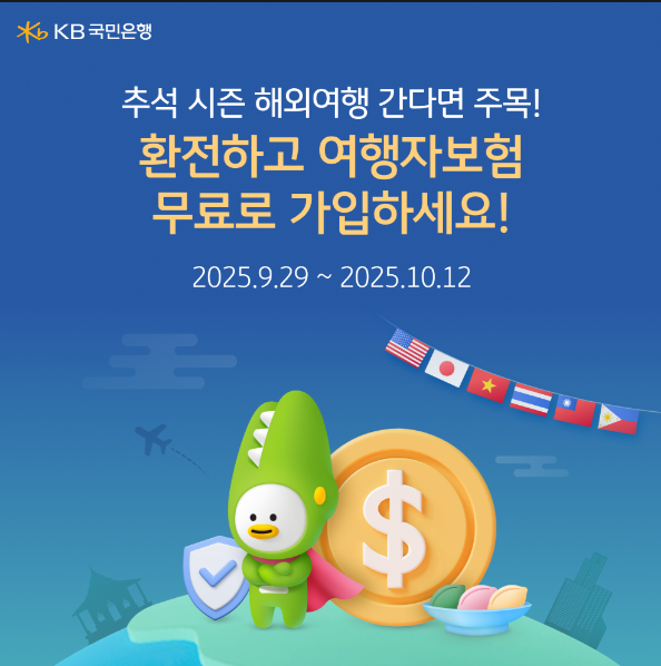 [일요주간 = 김완재 기자] KB국민은행(은행장 이환주)은 추석 연휴 기간 해외여행을 떠나는 고객을 위해 오는 12일까지 환전 고객 대상 무료 여행자보험 가입 혜택을 제공하는 특별 이벤트를 진행한다고 30일 밝혔다.