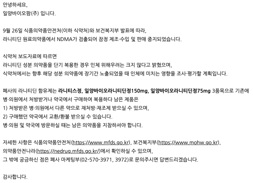 일양바이오팜의 품질 이슈는 이번이 처음이 아니다. 앞서 지난 9월 일양바이오팜은 라니티딘 성분 원료의약품에서 발암 우려 물질인 NDMA(N-니트로소디메틸아민)가 검출됨에 따라 ▲라니티스정 ▲일양바이오라니티딘정150mg ▲일양바이오라니티딘정75mg 등 3개 품목에 대해 잠정 제조·수입 및 판매 중단 조치를 겪은 바 있다.
