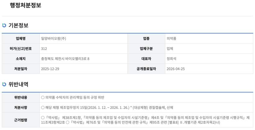 처분 내용은 일부 제형에 대한 제조업무정지다. 일양바이오팜은 2026년 1월 12일부터 1월 26일까지 15일간 경질캡슐제와 산제에 대한 제조업무를 할 수 없게 된다.