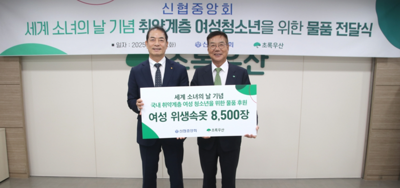 [일요주간 = 김완재 기자] 신협중앙회(회장 김윤식)는 지난 14일 ‘세계 소녀의 날’을 맞아 국내 취약계층 여성청소년을 위한 물품 전달식을 열고 초록우산어린이재단에 여성 위생속옷 8500장(약 2억 원 상당)을 전달했다고 밝혔다. 이번 행사는 소녀들의 기본 권리 보장과 건강한 성장을 지원하기 위한 취지로 마련됐다.