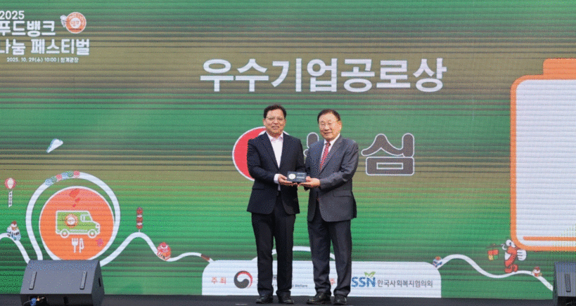 | ▲ 농심이 지난 29일 서울 청계광장에서 열린 ‘2025 푸드뱅크 나눔 페스티벌’에서 사회공헌 공로를 인정받아 보건복지부 장관상을 수상했다. 사진 왼쪽부터 농심 김보규 상무, 한국사회복지협의회 김성이 회장. (사진=농심 제공) |