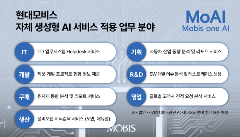 현대모비스는 진화하는 생성형 AI의 장점을 살려 사용 과정에서 임직원들의 피드백을 적극 반영해 서비스의 수준을 높이고 업무 적용 분야도 점진적으로 확대할 예정이다. 현재는 부서별 필요성을 감안해 연구개발, IT, 영업 등 7개 업무 분야에 적용 중이지만 올해 안에 법무와 경영지원 등 다른 부문에도 서비스 적용을 준비 중이다.