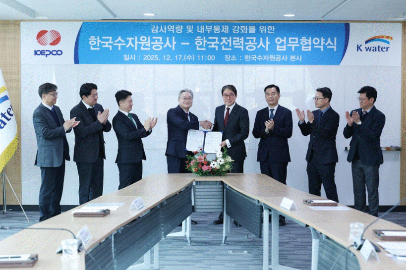 [일요주간 = 엄지영 기자] 한국수자원공사(K-water) 감사실은 12월 17일 대전 본사에서 한국전력공사와 기관 간 감사역량 및 교류 강화를 위한 업무협약(MOU)을 체결했다. 이번 협약은 기후에너지환경부 출범 이후 산하 핵심 공기업 간 첫 감사 분야 협력 사례로, 내부통제 강화와 감사 품질 제고를 위한 상호 협력의 출발점이 될 것으로 기대된다.
