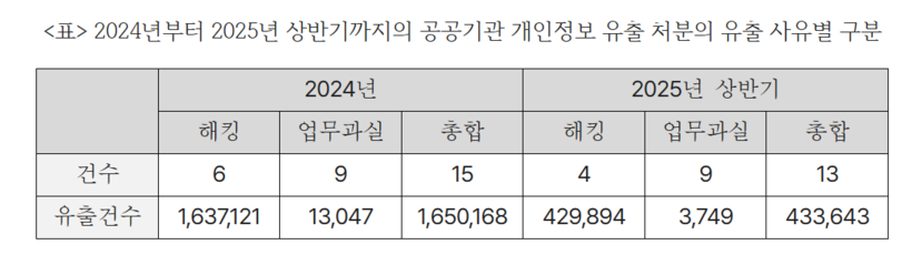 신장식 의원(조국혁신당)이 개인정보보호위원회로부터 제출받은 자료에 따르면 2025년 상반기 공공기관 13곳에서 총 43만 3643건의 개인정보가 유출됐으며 이 중 99%가량이 해킹으로 인한 피해였다.