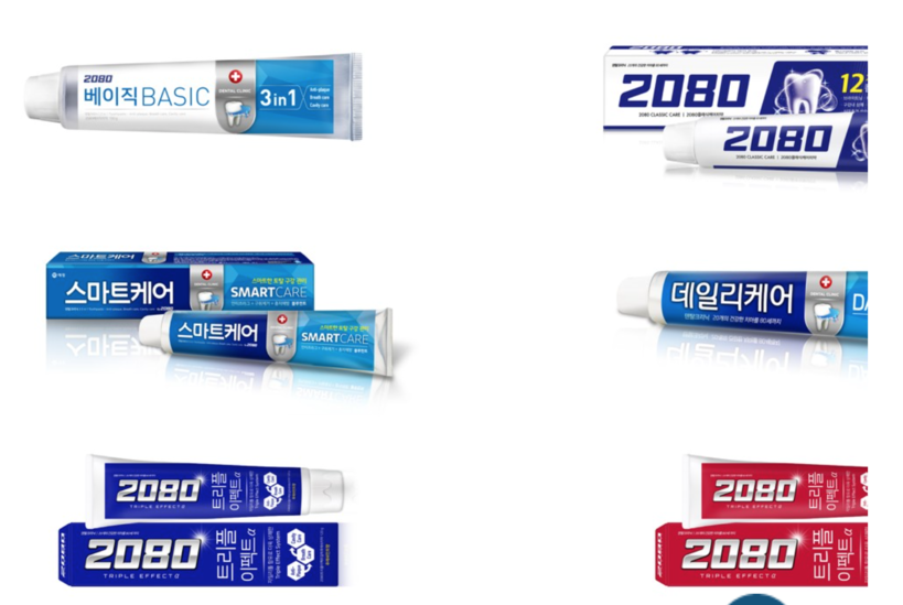 | ▲ 애경산업 ‘2080 치약’ 6종에서 금지 성분인 ‘트리클로산(triclosan)’이 검출되어 전량 회수. (사진=식약처 제공) |