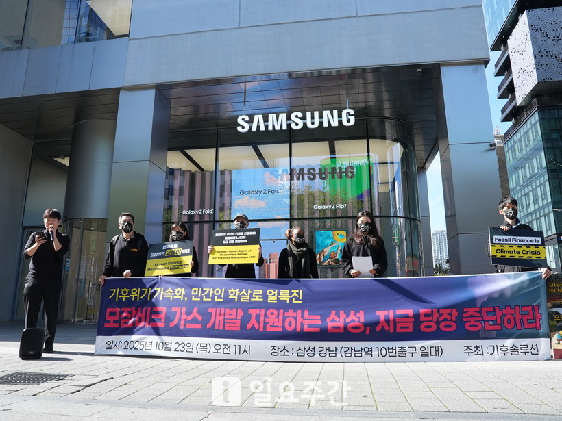 | ▲ 지난 23일 서울 서초구 강남대로 삼성전자 본사 앞에서 모잠비크 시민단체 JA와 국내 단체 기후솔루션이 공동 기자회견을 열고 삼성중공업의 모잠비크 가스전 사업 참여를 규탄했다. (사진=기후솔루션 제공) |