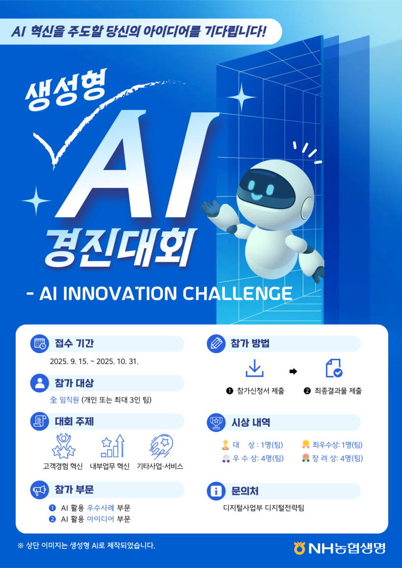 [일요주간 = 김완재 기자] NH농협생명(대표이사 박병희)은 15일부터 고객 경험 개선과 내부 프로세스 효율화를 핵심 주제로 전 임직원이 개인 또는 팀 단위로 참여해 실무 성과 사례와 신규 비즈니스 모델을 제안할 수 있는 ‘생성형 AI 경진대회’를 개최하고, 우수 아이디어는 구체화 과정을 거쳐 실제 업무 적용을 검토할 예정이라고 밝혔다.