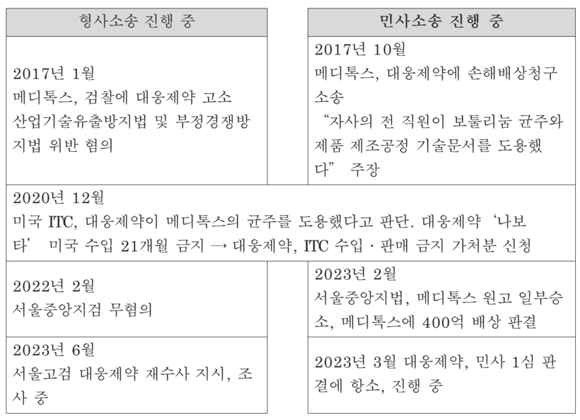 2023년 2월에는 서울중앙지법이 민사 1심에서 메디톡스의 일부 손을 들어주며 대웅제약에 약 400억 원의 배상을 명령했다. 현재 대웅제약은 항소심이 진행 중이다.