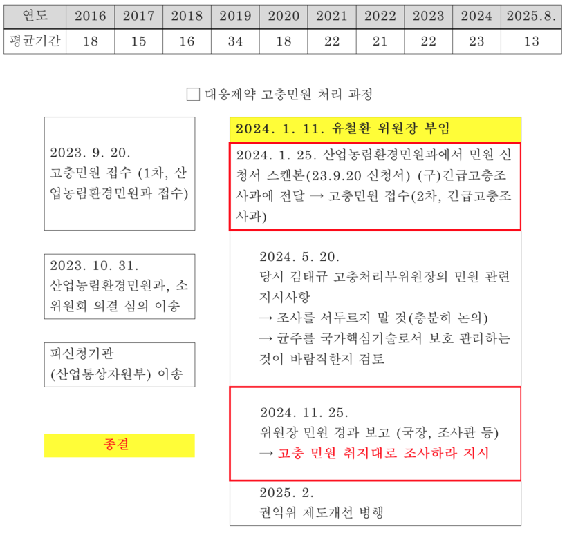 결과적으로 권익위가 이미 종결한 사건을 다시 열어 민원 조사에 착수한 셈이다. 이후 담당 과장은 세 차례, 담당 조사관은 네 차례 교체되는 등 내부 혼선이 이어졌고 처리 기한(최장 120일)을 훌쩍 넘겨 현재까지 결론을 내지 못한 상태다.