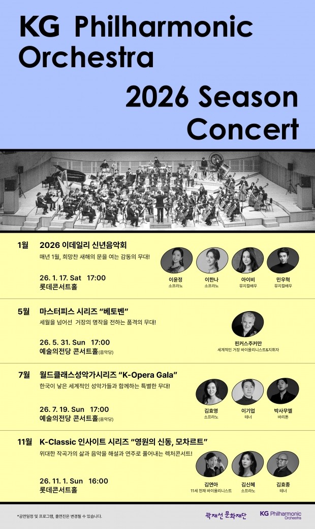 [일요주간=엄지영 기자] KG그룹 곽재선 문화재단이 KG필하모닉 오케스트라의 2026년 연간 시즌 계획을 공개하며 본격적인 클래식 음악 여정의 막을 올렸다. 정통 클래식부터 K-Opera까지 폭넓은 레퍼토리를 아우르는 이번 시즌은 5월부터 11월까지 이어지는 정기 공연을 통해 관객과 만날 예정이다.