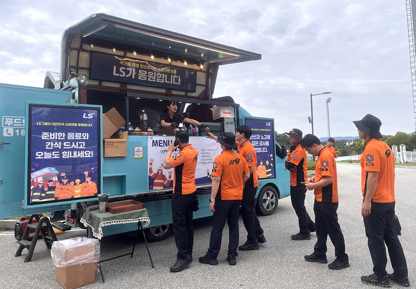 ▲ LS가 9일(화), 강릉 강북공설운동장 인근에서 소방공무원들에게 감사의 뜻을 전하기 위해 커피차를 운영하고 있다.(사진=LS) |