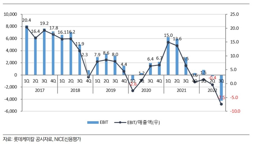 | ▲ 롯데케미칼 분기별 영업수익성 추이 (연결기준). 사진=NICE신용평가 |
