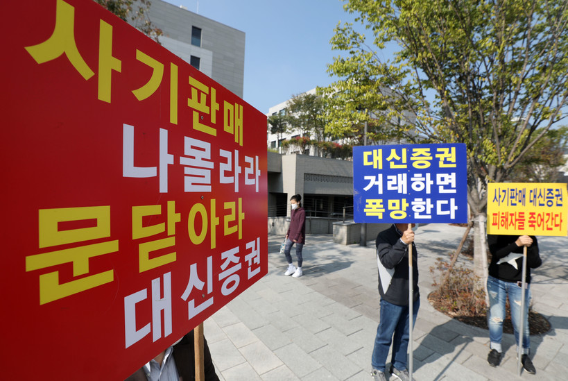 ▲대신증권 라임펀드 피해자 모임이 피켓을 들고 피해보상 촉구 집회를 하고 있다.(사진=newsis) |