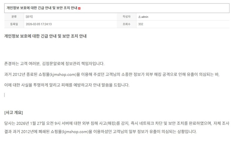 보안 수준이 낮은 과거 시스템의 허점도 고스란히 드러났다. 유출된 비밀번호는 숫자 4자리 이상의 단순한 형태로 현재의 보안 기준(8자리 이상, 영문·숫자·특수문자 조합)에 미치지 못한다. 회사는 현재 운영 중인 쇼핑몰과는 연동되지 않아 직접적인 도용 가능성은 낮다고 설명하면서도 동일한 비밀번호를 타 사이트에서 사용하는 고객들의 2차 피해를 방지하기 위해 출처가 불분명한 문자나 이메일에 유의해달라고 당부했다.