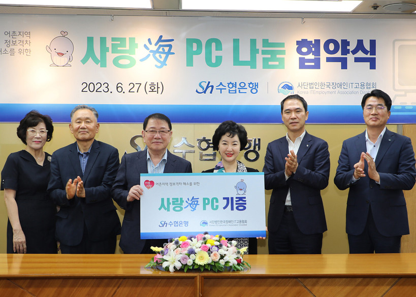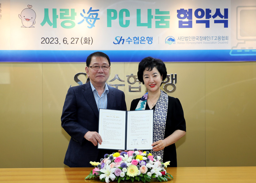 [일요주간=김영란 기자] Sh수협은행(은행장 강신숙)은 지난 27일, (사)한국장애인IT고용협회(대표 김용일)와 어업인‧장애인 등 디지털 정보 소외 계층을 지원하는「사랑海 PC나눔」협약을 맺었다.