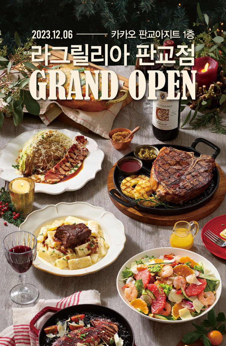 [일요주간 = 노현주 기자] SPC그룹의 이탈리안 캐주얼 다이닝 브랜드 '라그릴리아(LA GRILLIA)'가 경기도 판교에 13번째 지점을 개설했다. 판교역 근처 카카오 아지트 1층에 위치한 이 신규 매장은 383.7㎡ 면적에 133석을 갖추고 있다.