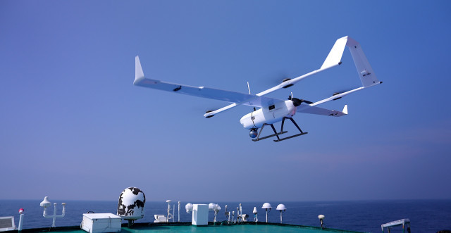 ▲ 동원산업이 세계 최초로 개발한 어군 탐지 전용 드론이 참치 어군을 찾기 위해 비행하고 있다. (사진=동원산업 제공) |