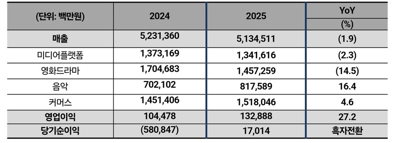 | ▲ CJ ENM 2025년 매출 5조 1,345억원, 영업이익 1,329억원 (이미지=CJ ENM ) |