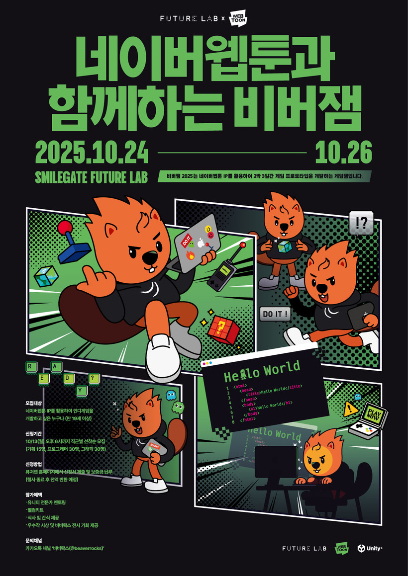 [일요주간=하수은 기자] 스마일게이트 퓨처랩(이사장 권혁빈)이 ‘네이버웹툰과 함께하는 비버잼’에 참가할 창작자를 24일부터 모집한다고 밝혔다.