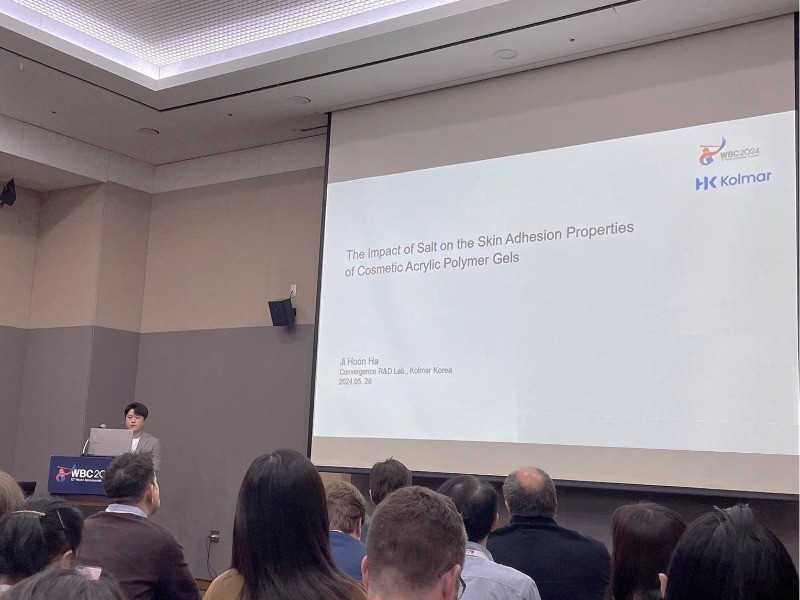 ▲ 한국콜마 융합기술연구소 하지훈 책임연구원이 최근 대구(엑스코)에서 열린 ‘2024 세계생체재료학회(WBC)’에서 ‘화장품의 피부 밀착력 증진 기술’을 발표하고 있다. (사진=한국콜마 제공) |