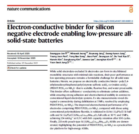 이번 연구는 국제 학술지 ‘네이처 커뮤니케이션스’에 지난해 12월 5일 게재되며 학계의 주목을 받았다. 심사위원들은 액체 전해질 배터리에서 제한적으로 활용되던 전도성 고분자 바인더가 전고체 환경에서도 안정적으로 적용될 수 있음을 입증한 점을 높게 평가했다.
