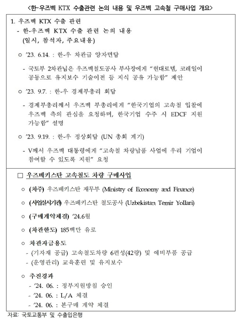 이 중 우즈베키스탄 고속철도 프로젝트는 국제경쟁입찰 없이 현대로템을 염두에 두고 추진된 것으로 확인됐다.