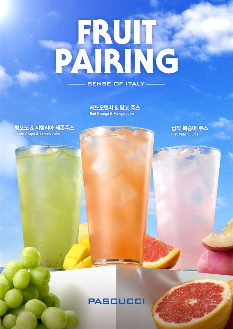 1일, 파스쿠찌에 따르면 신제품은 ‘프루트 페어링(Fruit Pairing)’을 콘셉트로, 여름철 인기 과일의 맛과 향, 색감을 살린 것이 특징이다. 출시된 음료는 ‘레드 오렌지와 망고를 조합한 레드 오렌지&망고 주스’, ‘청포도에 시칠리아산 레몬을 더한 청포도&시칠리아 레몬 주스’, ‘납작 복숭아를 활용한 납작 복숭아 주스’ 등 총 세 가지다.