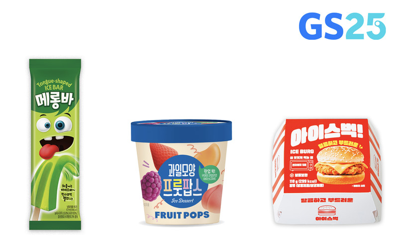 | ▲ GS25에서 출시한 메롱바, 젼언니 과일모양프룻팝스, 아이스벅 상품(사진=GS25리테일) |