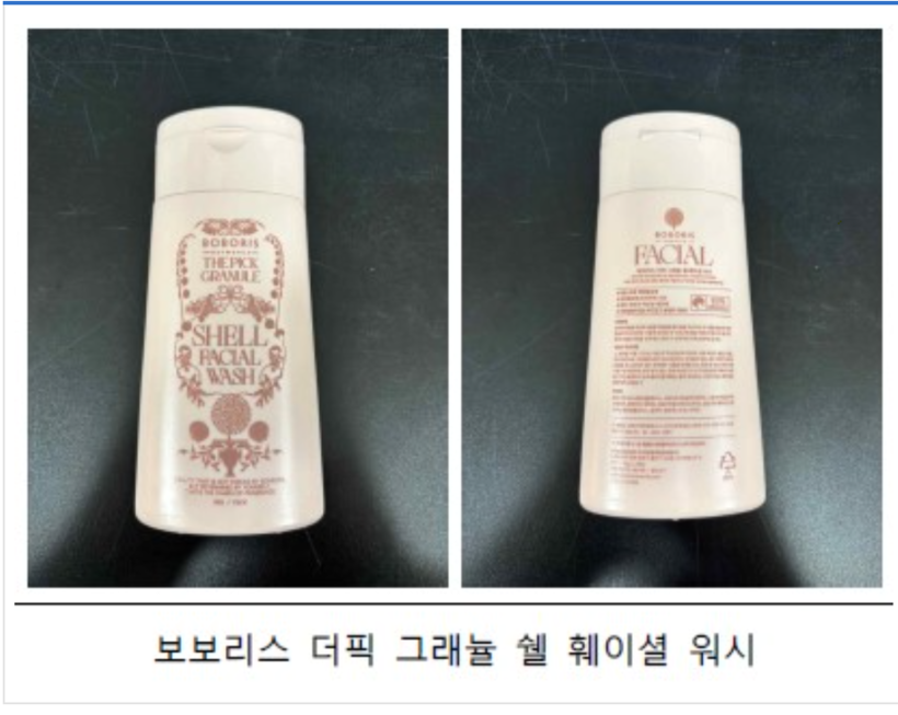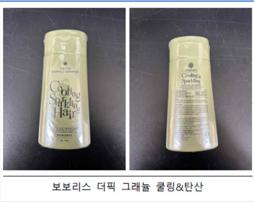 회수 대상 제품은 △보보리스 더픽 그래뉼 바디워시 (제조번호 BI21193) △보보리스 더픽 그래뉼 쉘 훼이셜 워시 (제조번호 BH21192) △보보리스 더픽 그래뉼 샴푸 손상모 (제조번호 BF21190) △보보리스 더픽 그래뉼 샴푸 쿨링&탄산 (제조번호 BE21193) 등 총 4종이다.