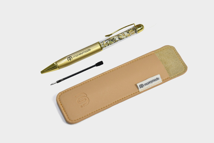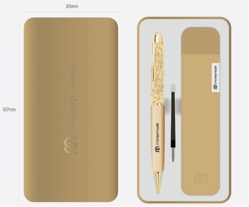 ‘황금볼펜’ 에디션은 황금색의 모던한 스틸 소재 케이스에 담겼으며, 구성품으로는 ▲황금볼펜 ▲리필심 ▲휴대용 가죽케이스가 포함된다. 돈볼펜은 기존 출시한 ‘모던형’ 바디 전체를 황금색을 입혔고, 볼펜 상단에는 약 5만원권 한 장 분량의 화폐 부산물이 들어가 있다. 특히 리필심 추가 제공으로 실용성을 높였고, 가죽케이스는 멋스러움과 소장가치를 동시에 만족시킨다. 각 부속품에는 공사의 화폐부산물 브랜드인 ‘머니메이드(moneymade)’로고가 각인되어 있다.