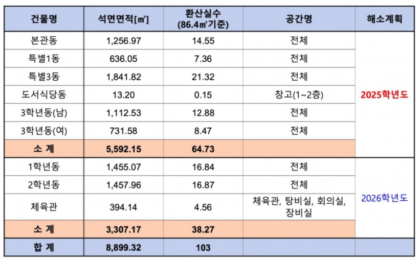 이어 “교육부의 무석면 학교 목표(2027년)와 전체 면적(약 8899㎡), 건물 수(9개 동)를 고려할 때 방학 기간만으로는 시간 확보가 어렵다”며 “예방 조치, 차단막, 음압기 설치 등 법적 절차에 따라 진행했으며 안전 문제에 대해 과도한 우려가 제기된 측면도 있다”고 말했다.