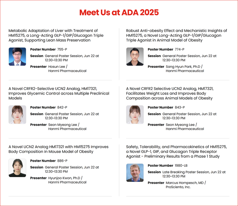 ▲ 한미약품이 ADA 2025에서 발표하는 주요 연구 포스터 초록 소개. (사진=한미약품 제공) |