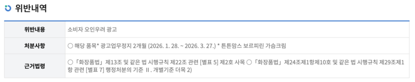 이에 따라 식약처는 ‘화장품법’ 제13조 및 같은 법 시행규칙에 근거해 해당 품목에 대해 광고업무정지 2개월의 처분을 내렸다. 처분 기간은 올해 1월 28일부터 3월 27일까지다.
