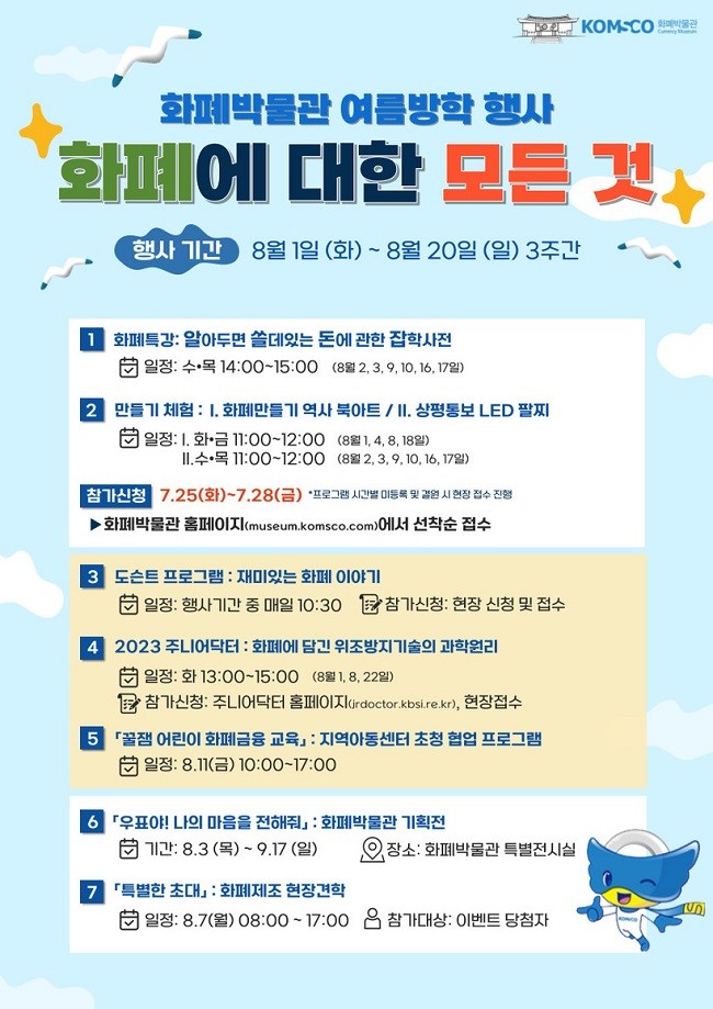 여름방학행사는 학예사와 함께 화폐 역사와 화폐 속 숨겨진 위조방지요소, 재미있는 이야기를 알아보는 「알쓸돈잡-알아두면 쓸데 있는 돈에 대한 잡학사전」, 화폐 속 문화유산과 역사인물을 배우며 나만의 화폐북을 만들어보는 「화폐 만들기 역사 북아트」, 주화 역사에 대해 알아보고 팔찌를 만들어보는 「상평통보 LED 팔찌 만들기」 등 유익하고 즐거운 프로그램으로 진행된다.