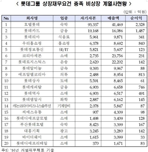 이런 요건을 충족한 롯데그룹 비상장 계열사에는 호텔롯데와 롯데정보통신 이외에 롯데카드, 롯데리아, 우리홈쇼핑, 코리아세븐, 롯데로지스틱스, 롯데알미늄, 에프알엘코리아, 롯데상사, 롯데캐피탈, 롯데역사, 롯데엠알시, 캐논코리아비즈니스솔루션, 씨에스유통, 롯데디에프글로벌, 부산롯데호텔, 대홍기획, 바이더웨이, 롯데디에프리테일 등이 있다.