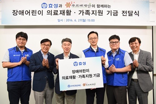 [일요주간=김완재 기자] 효성이 27일 서울 마포구 상암동에 있는 푸르메재단이 설립한 어린이재활병원에서 의료재활 전문기관인 푸르메재단에 저소득층 장애어린이∙청소년 의료재활 및 가족 지원기금 8000만원을 전달했다.