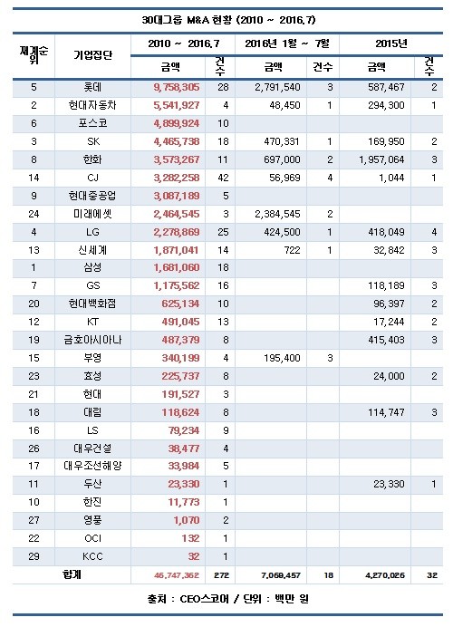 한편 국내 30대 그룹이 최근 6년여간 국내외에서 경영권을 넘겨받는 M&A 건수는 총 272건, 금액은 46조7473억원에 달한 것으로 집계됐다.