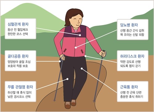 고혈압 환자는 등산 전 자신의 혈압을 체크하고 완만한 코스를 정해 한 번에 무리한 강도로 등산을 하지 않아야 한다. 당뇨병 환자는 공복상태에서 등산을 피하고 가벼운 간식거리를 챙길 필요가 있고, 발에 상처가 나지 않도록 조심하고 꽉 조이는 신발은 피해야 한다. 무릎 관절염 환자는 하산할 때 무릎에 무리가 올 수 있기 때문에 정기적으로 휴식시간을 갖고 가급적 둘레길과 같은 낮은 경사 코스를 선택하는 것이 좋다. 허리디스크 환자는 무리하면 증상이 더 악화될 수 있어 약한 강도로 산행하며 가능한한 평지로 걷는 것이 좋다.