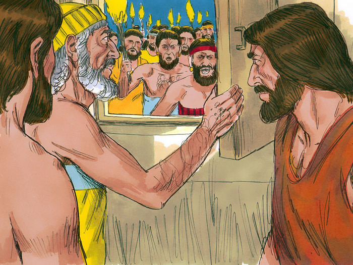 이에 아브라함은 50명, 45명, 40명, 30명이 있다면 어떻게 하겠느냐고 반문했고, 야훼는 의인이 10명만 있더라도 멸망치 않겠다고 했다. 그러나 의인은 열 명이 되지 않았다.(창세기 18장) 결국 야훼는 두 도시를 파괴하기로 확정하였지만 (사람의 모습을 취한) 천사 둘을 미리 보내 롯과 그의 가족을 구하게 했다. 밤이 되자 소돔 사람들이 롯의 집을 에워싸고 두 손님을 내보내라고 요구했다.