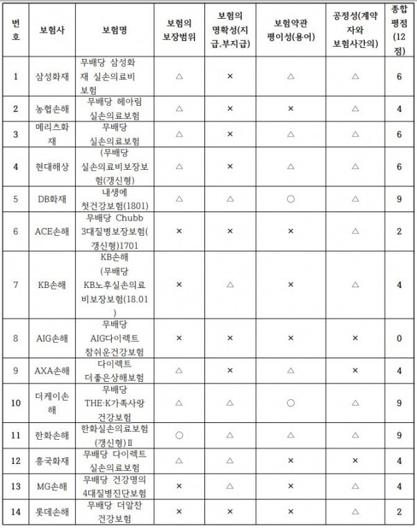 그 결과 가장 높은 점수를 받은 손보사는 DB화재보험 ‘내생에 첫건강보험’,더케이손해보험 ‘무배당 THE?K가족사랑 건강보험’, 한화손해보험 ‘한화실손의료보험 갱신형Ⅱ’ 등이 9점을 받았다. 반면 AIG손해보험의 ‘무배당 AIG다이렉트 참쉬운건강보험’은 유일하게 0점을 기록했다.