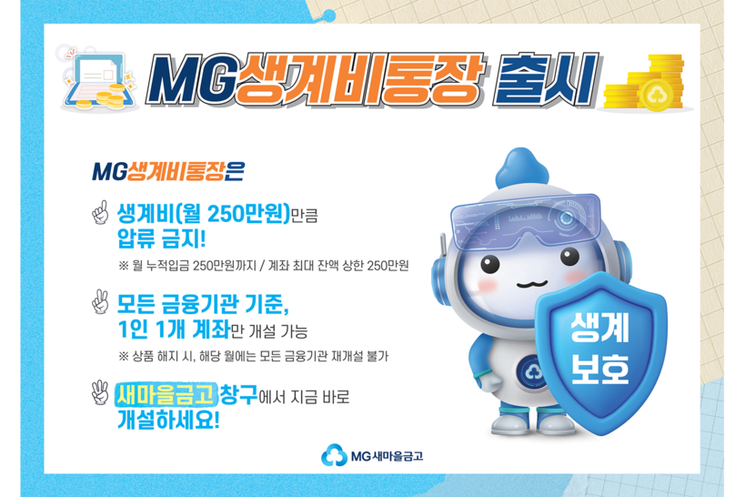 [일요주간=김완재 기자] 새마을금고중앙회(회장 김인)가 생계유지에 필요한 예금을 보호하는 ‘MG생계비통장’을 출시했다고 2일 밝혔다.