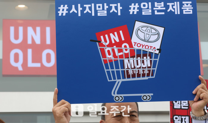 | ▲ 한 시민단체 관계자가 유니클로 앞에서 일본 제품 불매 운동을 하고 있는 모습. 롯데쇼핑은 한국 유니클로 운영사 지분 49%를 보유하고 있다. |