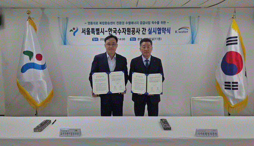 한국수자원공사(K-water, 사장 윤석대)는 4월 6일 서울특별시 도시기반시설본부 대회의실에서 서울특별시와 ‘영동대로 복합환승센터 수열공급사업 실시협약’을 체결하며 도심 대형 복합시설과 지하 복합공간으로 수열에너지 공급을 확대하는 기반을 마련했다.