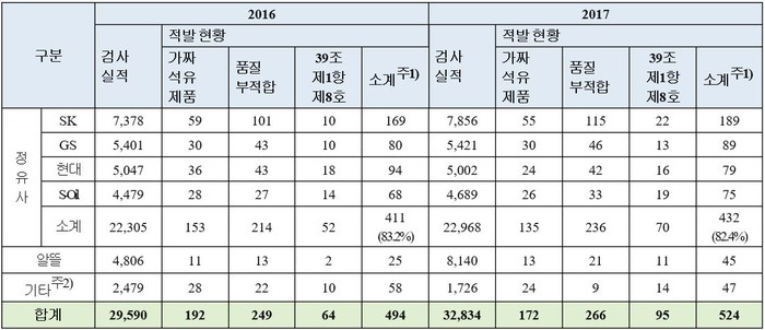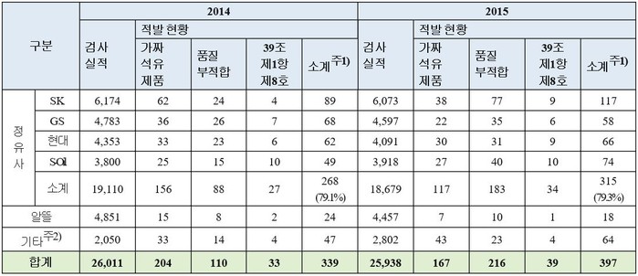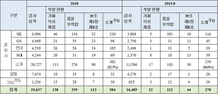 이 같은 불법행위의 80% 이상이 SK, GS, 현대, S-Oil 등 대기업 정유사로 나타났다. 그 중에서도 SK주유소가 2014년 89건, 2015년 117건, 2016년 169건, 2017년 189건, 2018년 210건으로 5년 간 총 774건으로 가장 많은 적발건수를 기록했다.