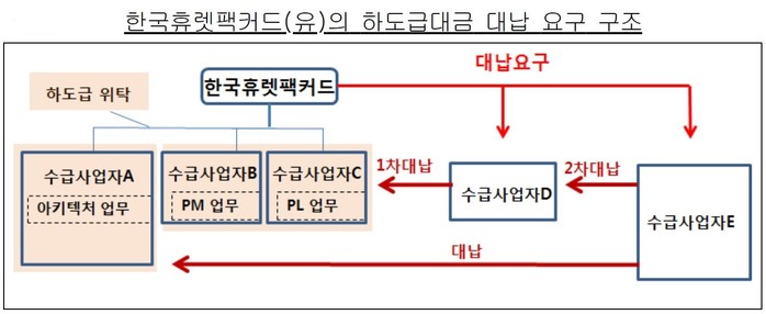 HP는 2013년 11월 수급사업자 E사로 하여금 향후 진행될 사업 관련 계약 체결을 빌미로 자신이 수급사업자 A사에 지급할 KT 용역 하도급대금을 대신 지급하도록 요구한 것으로 드러났다.