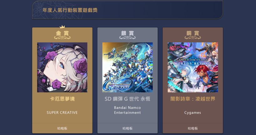 올해로 17주년을 맞은 이 시상식은 대만 게임 시장에서 작품의 인지도와 화제성을 가늠하는 대표적인 지표로 평가받고 있다. 모바일 게임 부문은 공식 게시판 이용자 반응을 기준으로 순위를 산정해 상위 3개 작품을 선정했으며 이 가운데 ‘카제나’가 1위에 올라 금상을 수상했다.