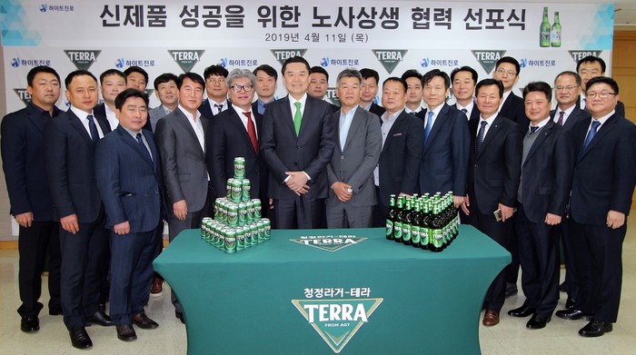 [일요주간=박민희 기자] 하이트진로(대표 김인규)는 지난 11일 서울 서초동 본사에서 노사상생 협력 선포식을 개최하고 선언문을 발표하며 신제품 테라의 성공에 매진하겠다고 밝혔다.