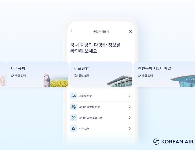 대한항공은 기존 인천국제공항 중심으로 제공하던 ‘공항 미리보기’ 서비스를 국내 전 공항으로 확대 적용한다고 밝혔다. 이에 따라 김포, 김해, 제주, 대구, 청주, 울산, 광주, 여수, 사천 등 주요 공항을 포함한 총 10개 공항의 정보를 하나의 앱에서 확인할 수 있게 됐다.